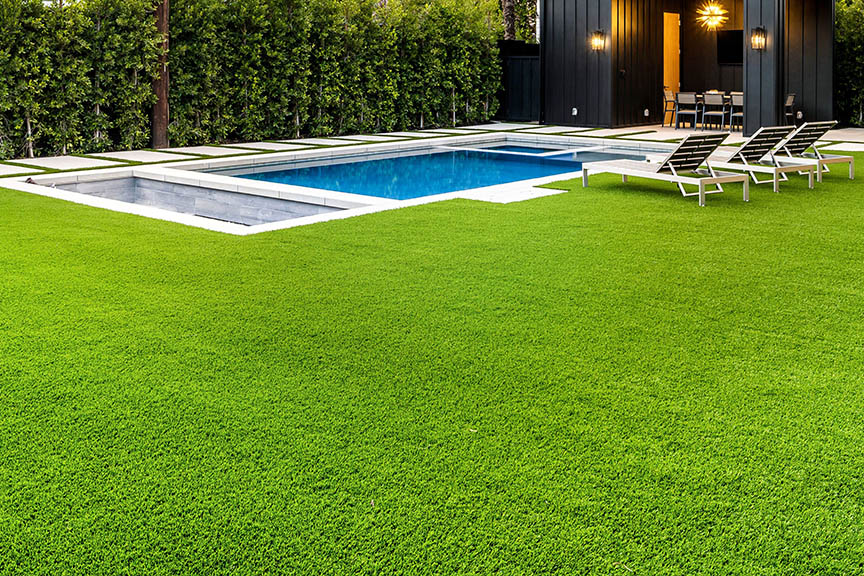 Another popular use for fake grass is in areas that traditional grass may falter, such as around a pool where there may be a lot of chemicals that could be detrimental to plants.